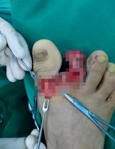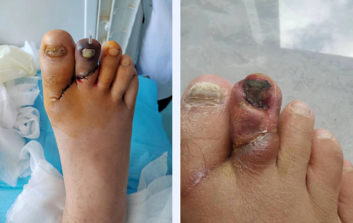 患者刘先生年仅37岁,是家里的主要劳动力,在家干活时右足第1、2趾不慎被角磨机割伤,受伤后紧急在家简单止血包扎,听闻延安市中医医院手足外科长期开展断指再植治疗,遂急来延安市中医医院手足外科寻求帮助。