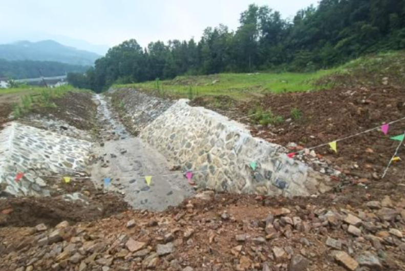 沿着泥石流被冲刷的地方向前进,看见了被泥石流部分掩埋的导流渠,这条渠是根据当地降雨量、汇水面积和水流径向修建的泄洪渠。主要作用是引流排水和泄洪,现一部分渠道被泥石流掩埋。通过现场堆积的泥石流清晰可见,当地土质以沙土夹裹块石为主,较为松散,遇洪水易形成泥石流,危害性极高。