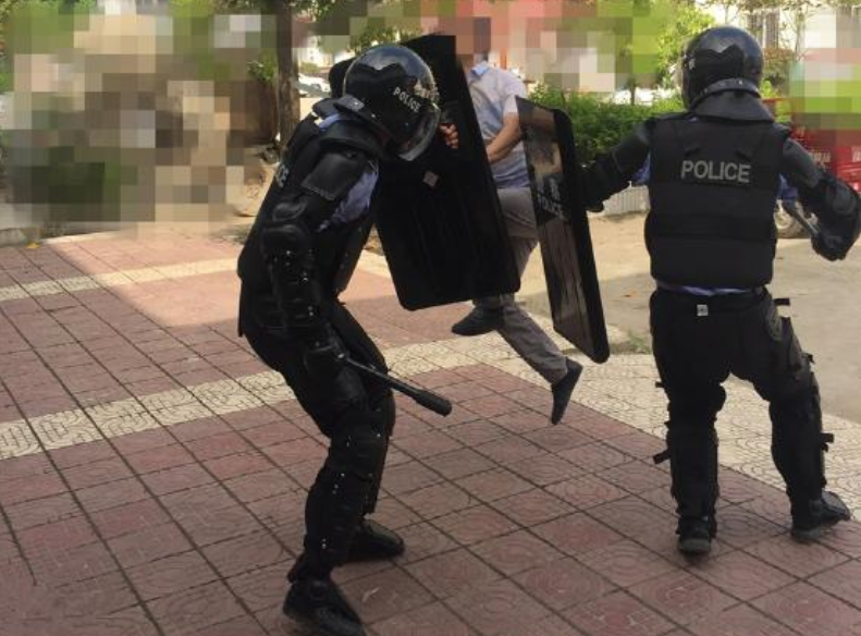 演练由两名队员充当情显员,模拟醉酒男子因矛盾纠纷手持砍刀攻击另一名当事人。接警后,民辅警迅速携带单警装备、盾牌、防爆叉等警具,赶赴现场开展紧急疏散、维护秩序、情况上报等应急处突工作。