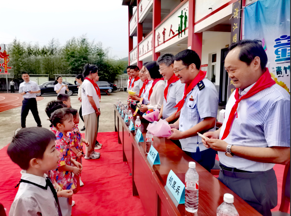 少先队员代表为“大朋友”系上红领巾,送上手工作品。