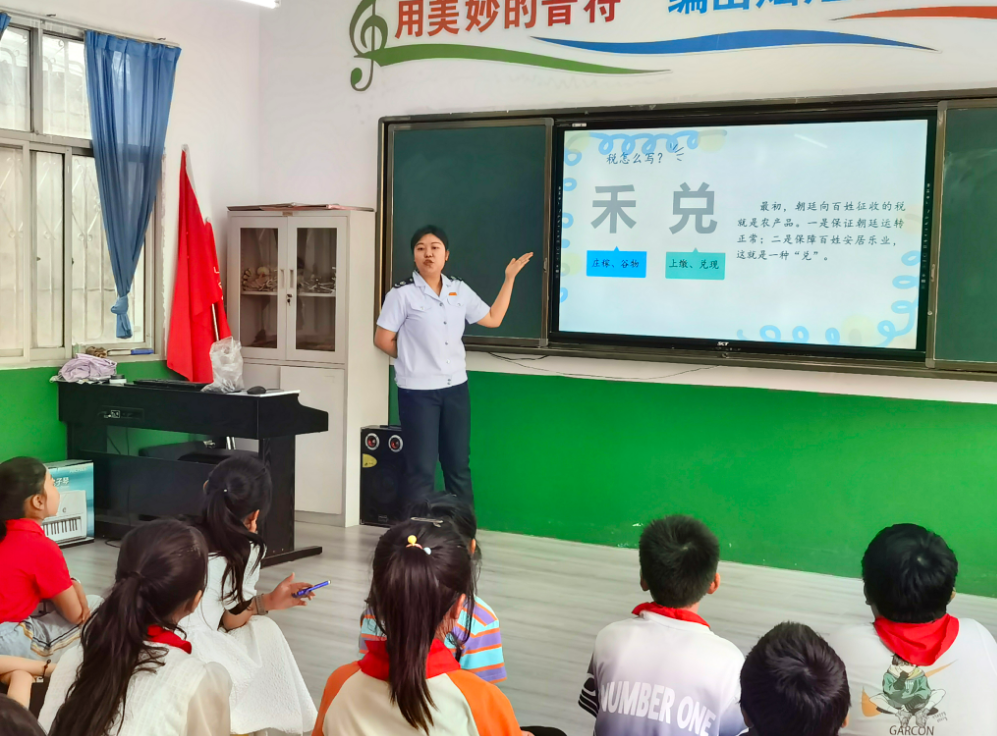 室外活动结束后,县税务局青年干部刘欣雨走进课堂,用生动的语言,为小学生们上了一堂税法基础知识宣传课。在宣传课中,孩子们饶有兴趣地了解了税收发展历程,从衣食住行和日常生活的鲜活实例里,明白了依法纳税的重要意义。在提问环节,同学们踊跃参与,刘欣雨对大家的回答做出补充和拓展,并赠送“小奖品”。