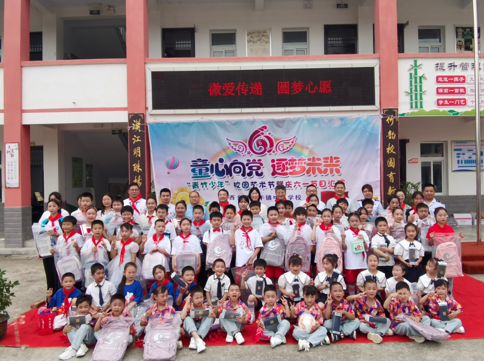 活动中,“微心愿使者”为同学们发放书包、文具袋、足球、运动鞋等文化体育用品,寄语大家好好学习、茁壮成长。