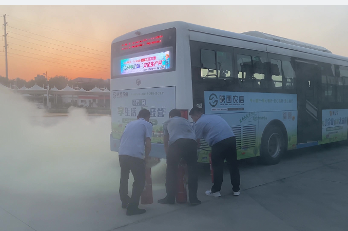 科目二:在公交车辆突发事件逃生疏散演练模拟场景中,载有乘客的新能源公交车行驶过程中突发电路故障引起火灾,驾驶员发现车厢内冒出浓烟,紧急靠边停车,打开车辆前门、后门,立即疏散车上乘客。立即使用车载灭火器向车辆着火部位灭火,然后拨打应急电话请求救援。通过演练,培训驾驶员熟练掌握消防器材的使用方法,熟悉车内逃生路径,切实增强了驾驶员的事故处置能力。