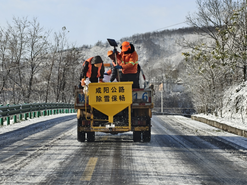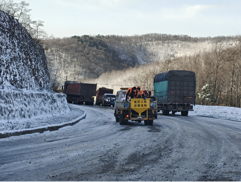 咸阳市公路局永寿管理段立即启动公路防滑保畅应急预案,出动融雪剂撒播车2台、应急抢险人员11人,全线撒播融雪剂融冰除冰,在急弯、陡坡处抛撒防滑料防,防止路面湿滑,同时提醒、引导过往驾驶员小心通过。