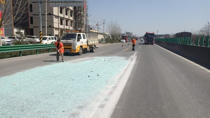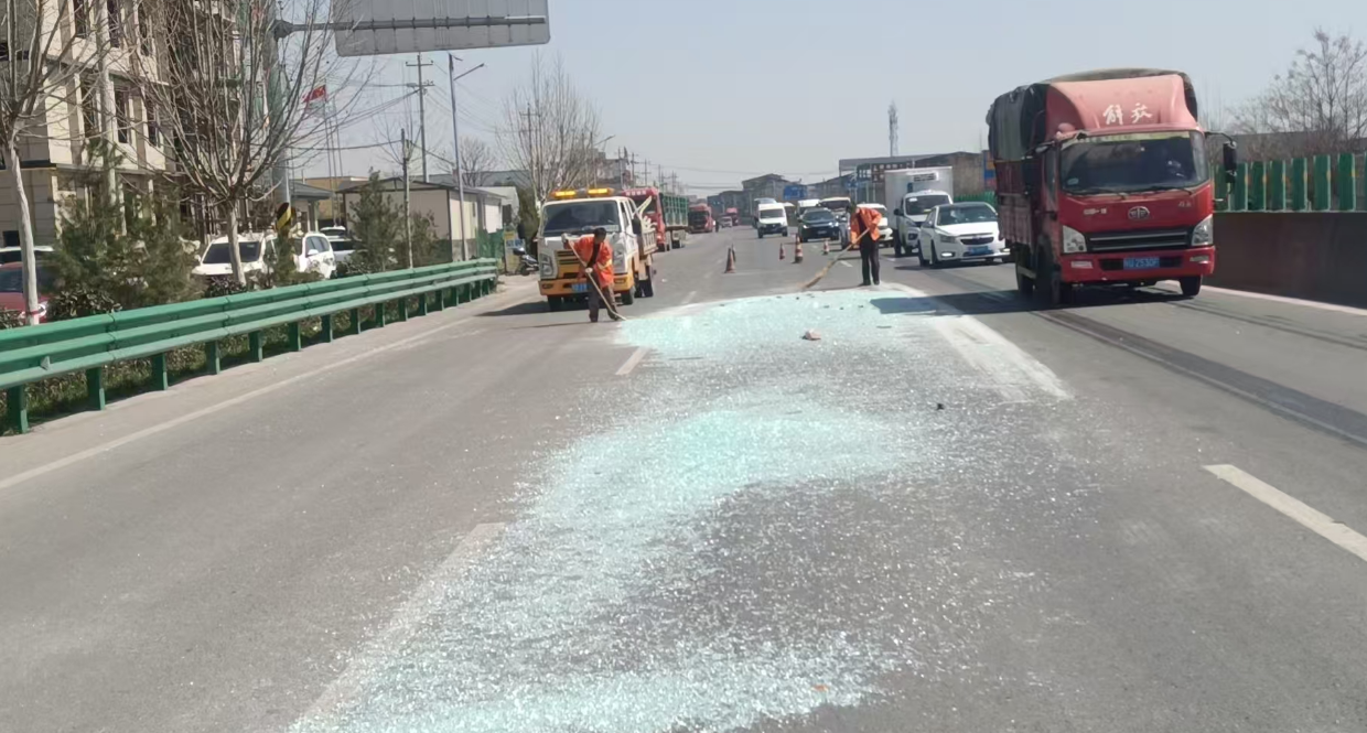 3月20日,咸阳公路管理局三原管理段巡查人员巡查到G108K1296+700处,发现路面上有大面积玻璃抛洒,侵占半幅路面,影响行车安全,巡查人员联系路保人员指挥交通,养护人员及时进行清理,经过30分钟紧急清理,道路畅通了。