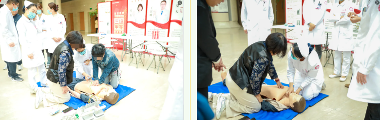 急危重症科医护团队通过通俗讲解、动画演示,拆解心脏骤停的危害与“黄金4分钟”的重要性,重点普及CPR“判断意识-胸外按压-开放气道-人工呼吸”核心步骤,用“跟着节拍器按压”“模拟异物清理”等趣味方式化解操作难点。