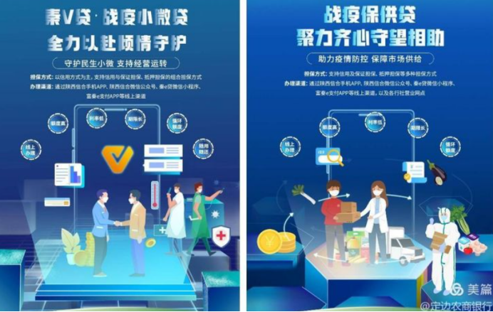 守护民生,全力战疫。“秦V贷•战疫小微贷”,是为疫情防控期间从事粮、油、肉、蛋、菜、奶等涉及“粮袋子”“肉盘子”“菜篮子”及其他保障民生的重要生活物资产业链上的民营小微企业及个体工商户提供的高效便捷、7*24小时、足不出户、循环额度、随借随还的线上线下一体化贷款服务。客户经理主动加班加点上门宣传“战疫快贷”产品,并按照涉疫保供农资供应贷款“特事特办、快事快办、急事急办”的原则提供优先服务。部分业务申请至钱款到账只用了不到2个小时的时间,快速满足了商户在疫情期间的及时性资金需求。