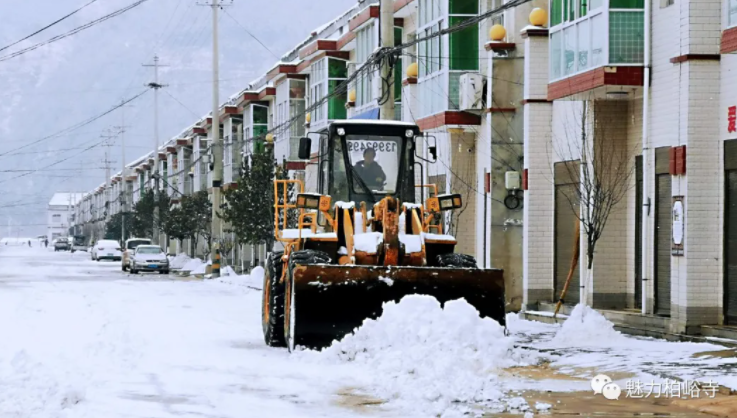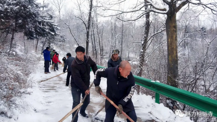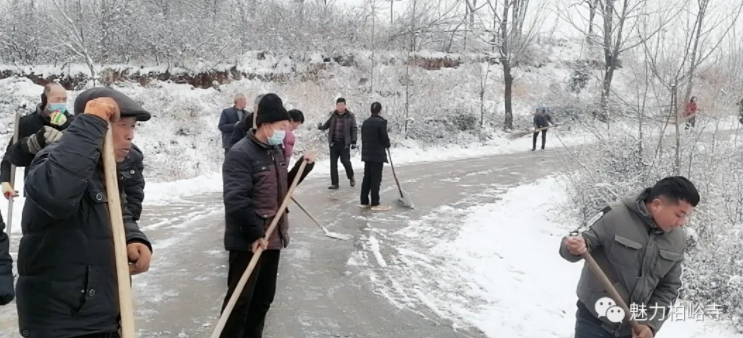在柏峪寺镇党委、政府的组织动员下,全体镇村党员干部、志愿者和广大群众不畏严寒,纷纷扛起铁锹、扫帚加入除雪队伍,在全镇范围内开展了一场“清扫积雪大会战”。冰雪经过寒夜的冷冻,死死抓着地面,很难清理,只能用铁锹将其分成小块,一点点清理。现场只见铁锹翻飞,扫帚舞动,大家尽管冻得双手通红、腿脚麻木,但没有一个人停下来休息片刻。经过半天的奋战,镇村办公场所周边、各主干道路积雪基本清除。