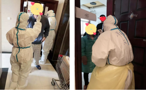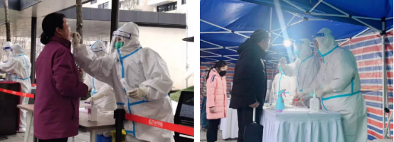 12月25日,气温骤降,采集队接到紧急通知,需立即前往某小区进行核酸采集,他们迅速行动,早上五点开始了采集工作。天空还是黑漆漆的,他们冒着寒风,对排队的居民进行信息核对、核酸采集。渐亮的天空中突然飘起了雪花,为了防止电脑、棉签和试管被打湿影响检测速度,他们用自己的身体将其护住,周围的居民看见他们冻得直发抖,甚至撕不开棉签包装纸,纷纷为他们送来了暖宝贴、电暖扇等御寒物品。虽然天寒地冻,但居民的关怀让采集队全体人员心中燃烧起一团团烈火,冷意褪去,周身被温暖环绕。