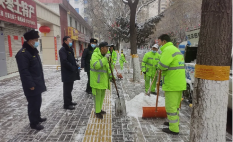 在收假开工的第一天,为了全力做好城市管理服务保障工作,宝塔玉禾田、宝塔波普公司全体环卫工人和城区12个执法中队203名党员干部职工,对城区重点路段、人行道、公交港湾、公园广场进行了人工清雪作业,并沿城市街道组织企业、商场、门店清理街道积雪,积雪清扫工作严格按照清扫堆积、集中清倒的方式进行,确保消除将人行道积雪扫入主次干道造成二次结冰隐患,有序、有效、全力恢复城市市容秩序。